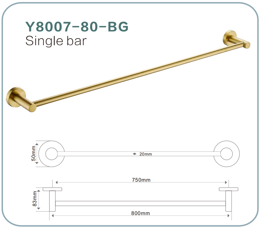 The BISTONE Y8007-80 Single Towel Bar combines sleek minimalist design with solid durability, making it a stylish addition to any contemporary bathroom. Crafted from premium solid brass, this wall-mounted rail ensures lasting performance, superior resistance to corrosion, and a luxurious aesthetic finish.