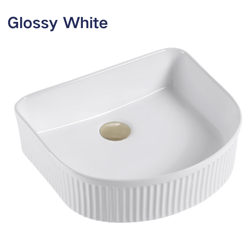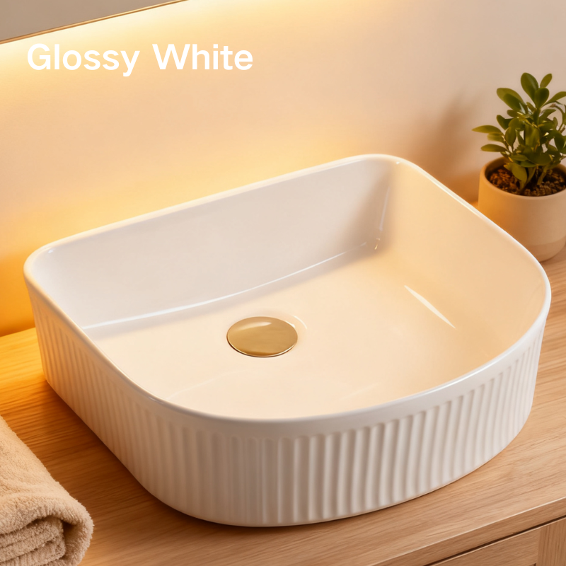 This art basin is available in two finishes, Glossy White and Matte White, with dimensions of 415×370×120mm for above-counter mounting.