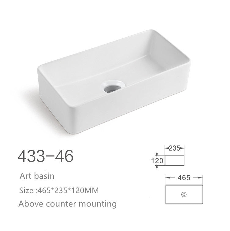 The Art Basin 433-46 Glossy White features a sleek rectangular shape with clean lines, designed to elevate modern and minimalist bathroom aesthetics. Its compact 465×235×120mm size makes it ideal for small vanities or powder rooms. Crafted from premium ceramic with a high-gloss finish, it provides a smooth surface that is easy to clean and resistant to scratches and stains.