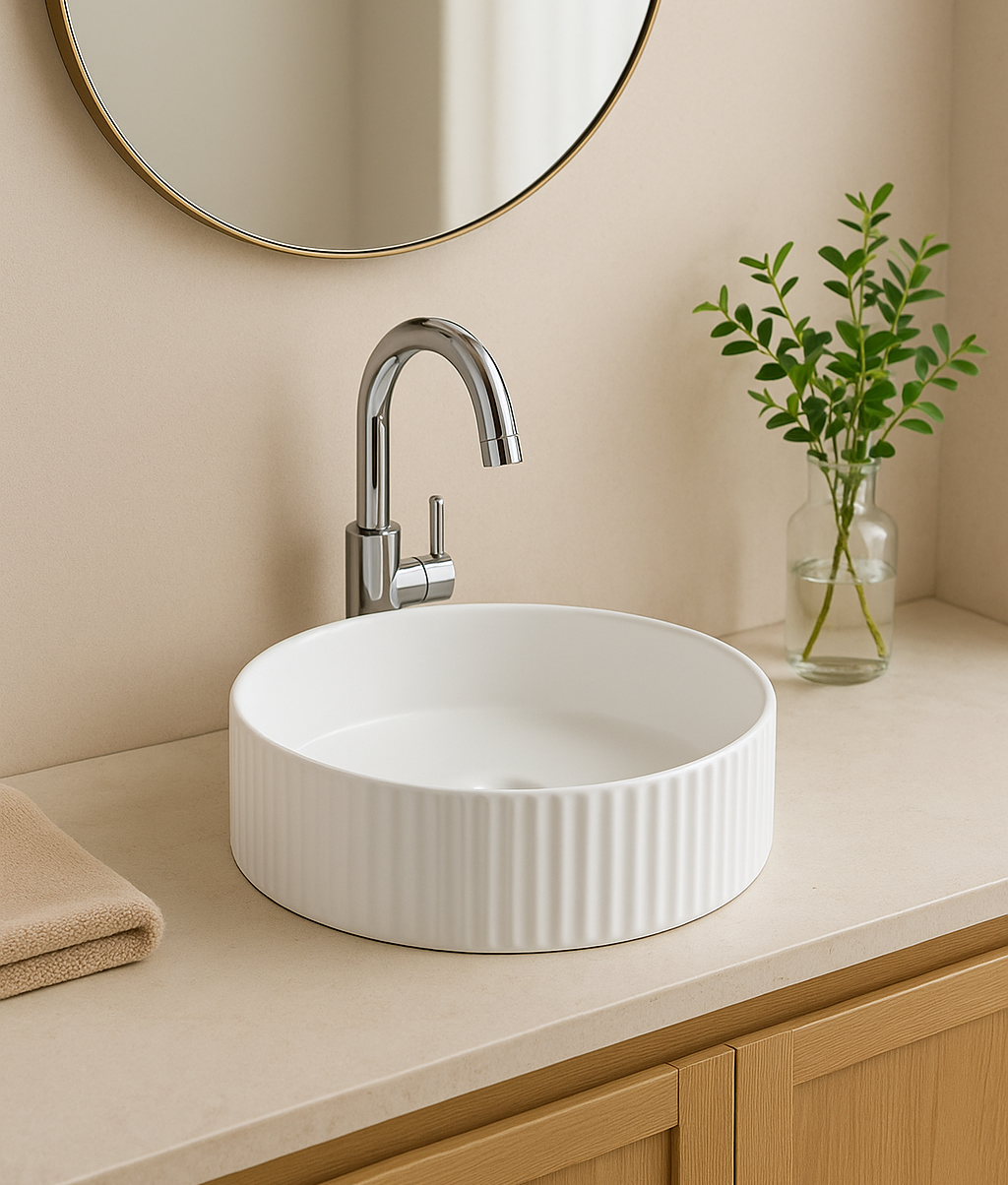 The Art Basin 499-40D features a round bowl with vertical ribbed sides and a smooth matte white finish, creating a modern minimalist aesthetic. Sized 400×400×125mm and designed for above counter installation, it offers durable ceramic construction with easy maintenance and timeless elegance, making it an ideal choice for contemporary bathrooms.