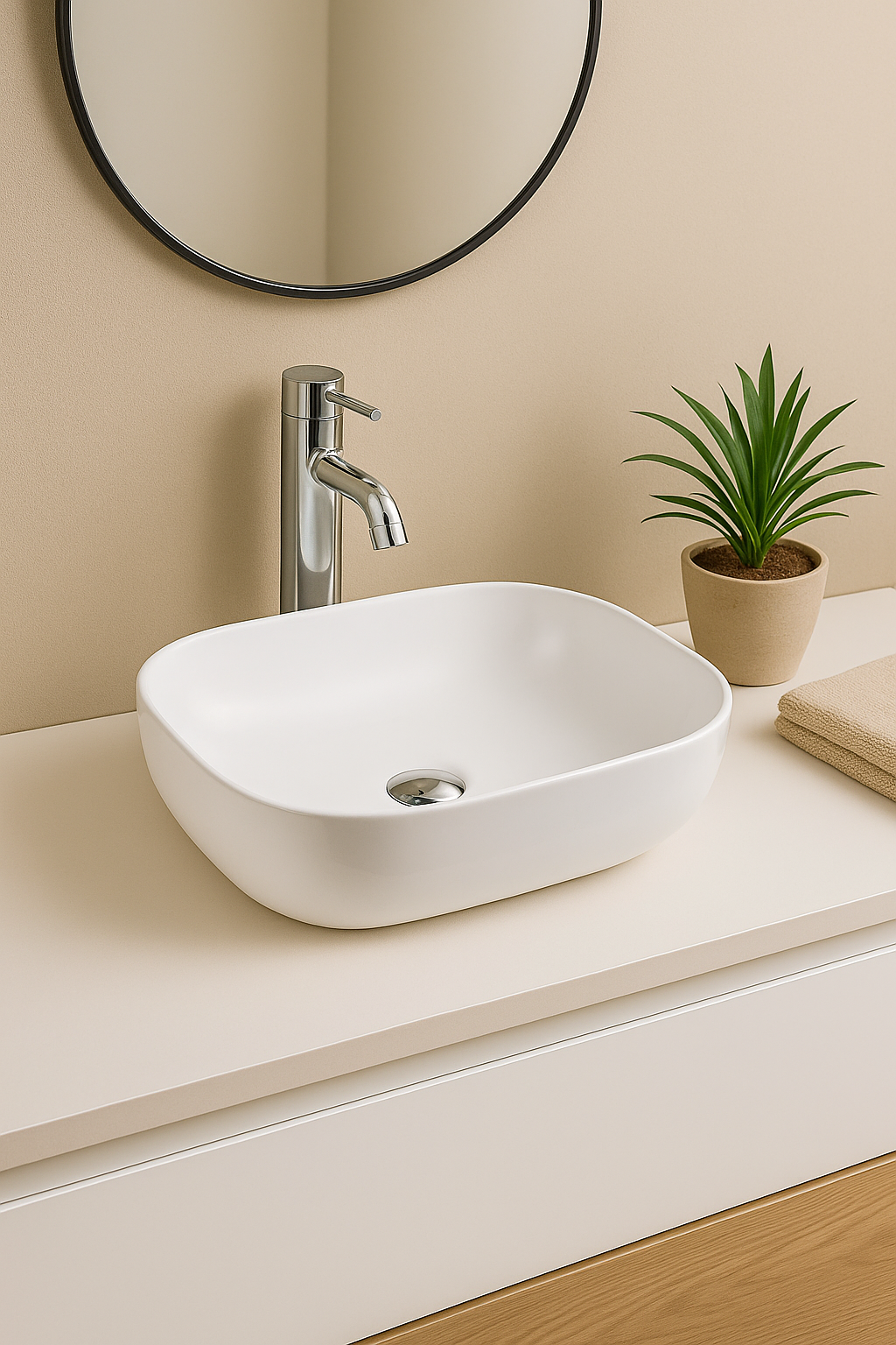 The Art Basin 8217 features a clean and minimalist rectangular design with glossy white ceramic finish that enhances modern bathroom aesthetics. With dimensions of 495×390×150mm, it offers ample depth and functionality for daily use while maintaining a sleek, above-counter installation style.