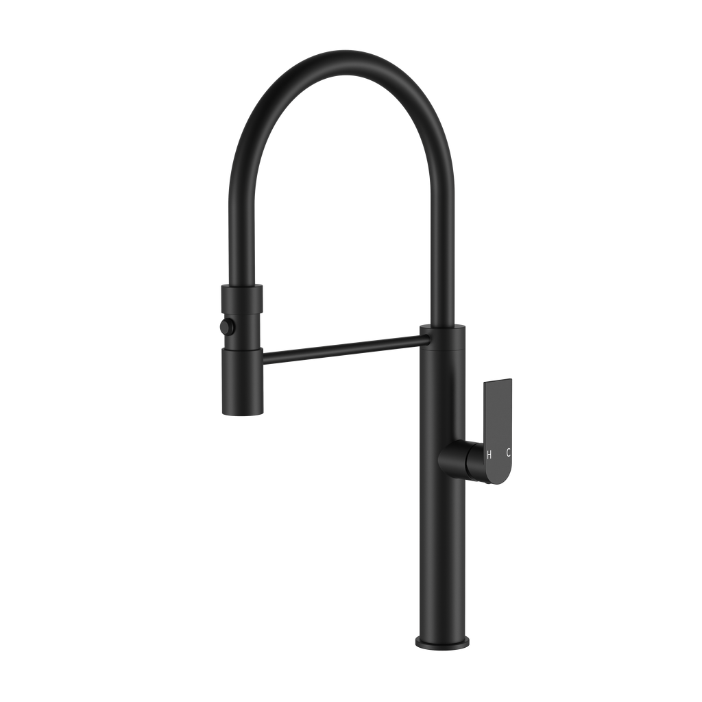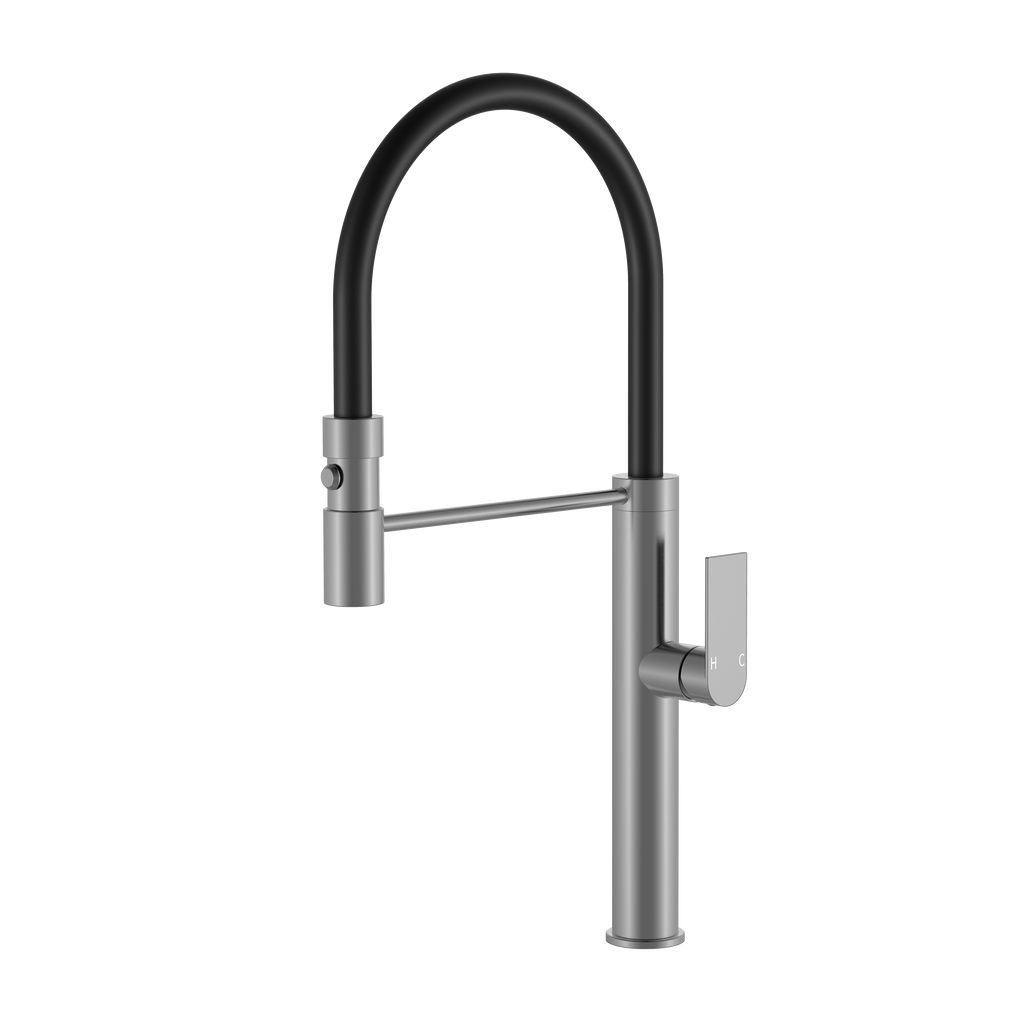 The BISTONE 82H66-D Industrial Pull-Out Kitchen Mixer Tap combines a bold professional profile with everyday practicality. Its high-arc U spout and flexible black silicone hose deliver long reach and effortless maneuverability, while the sleek cylindrical body with side handle (82H51) offers intuitive control of water flow and temperature — ideal for busy kitchen environments.