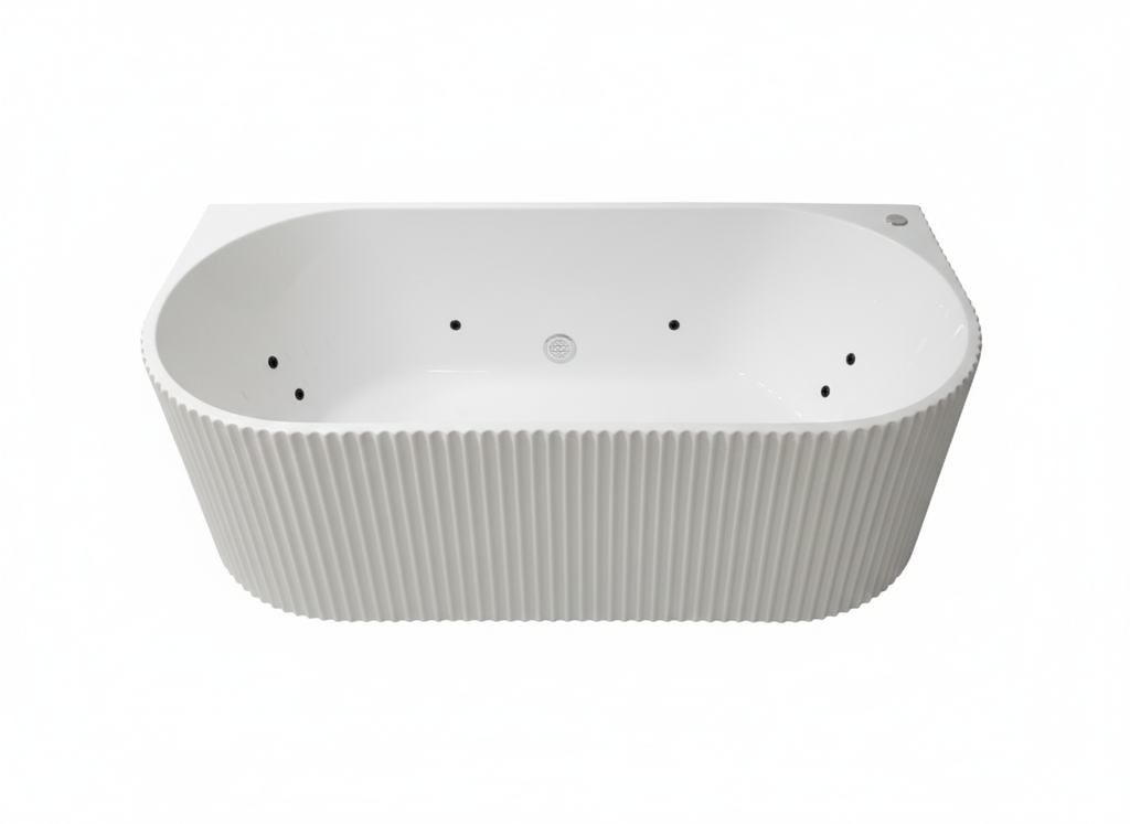 The BISTONE B-7332 SPA Back-to-Wall Freestanding Bathtub combines luxurious aesthetics with functional space efficiency. Its fluted exterior panel introduces texture and visual rhythm, creating a modern architectural statement in any bathroom. Designed for placement directly against the wall, it maximises floor space while maintaining the freestanding look.