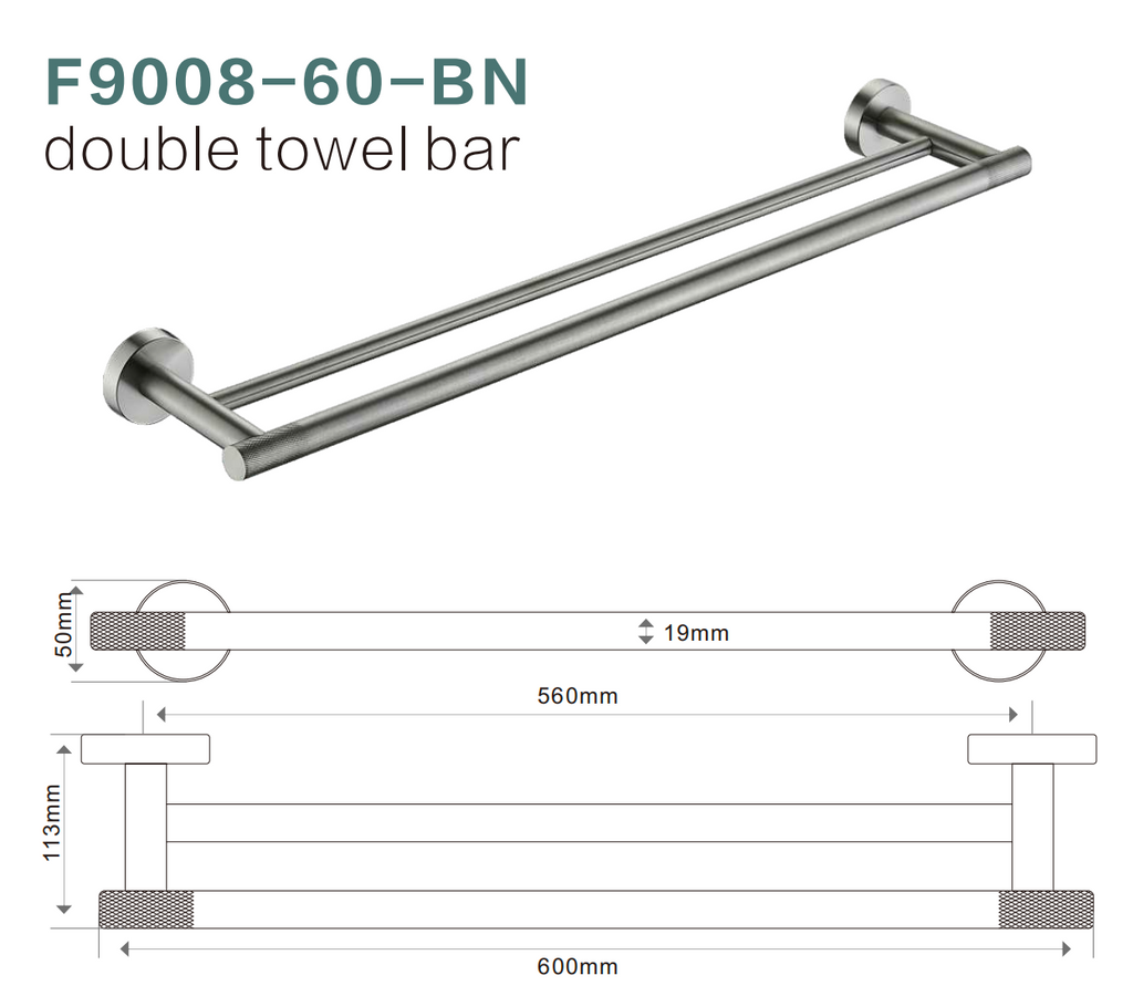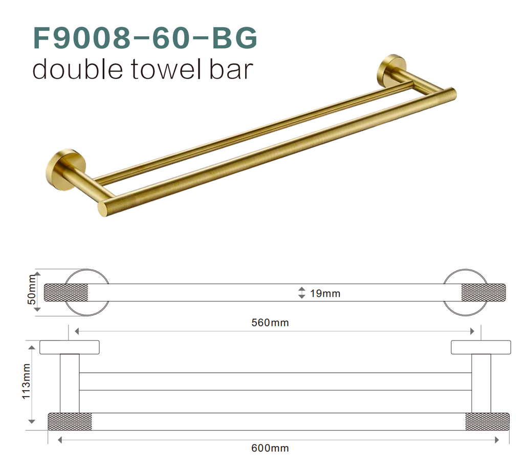 The BISTONE F9008-60 Double Towel Bar features a sleek, cylindrical profile with dual rails, offering enhanced towel storage capacity while maintaining a refined minimalist aesthetic. Constructed from premium solid brass, it ensures long-lasting durability, corrosion resistance, and a luxurious surface finish suitable for any modern bathroom.