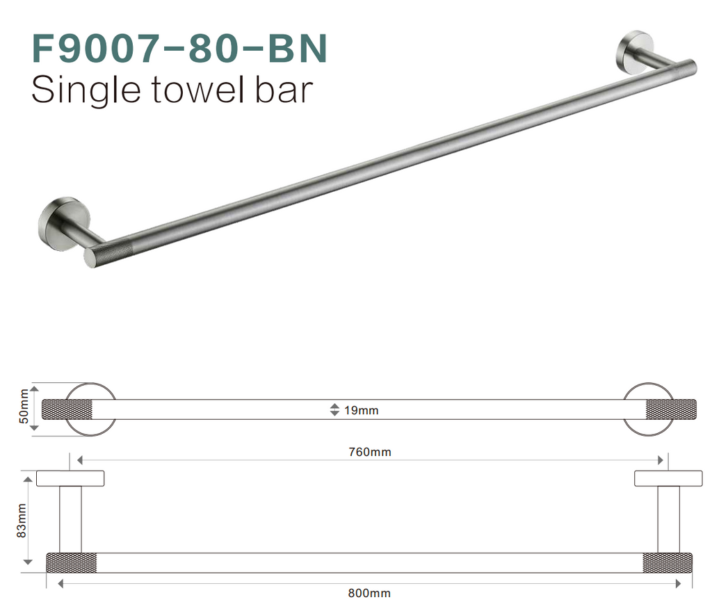 The BISTONE F9007-80 Single Towel Bar embodies simplicity and elegance, offering an elongated 800mm design ideal for larger towels and contemporary bathroom layouts. Crafted from premium solid brass, this wall-mounted rail ensures excellent durability, corrosion resistance, and a refined, luxurious surface finish.